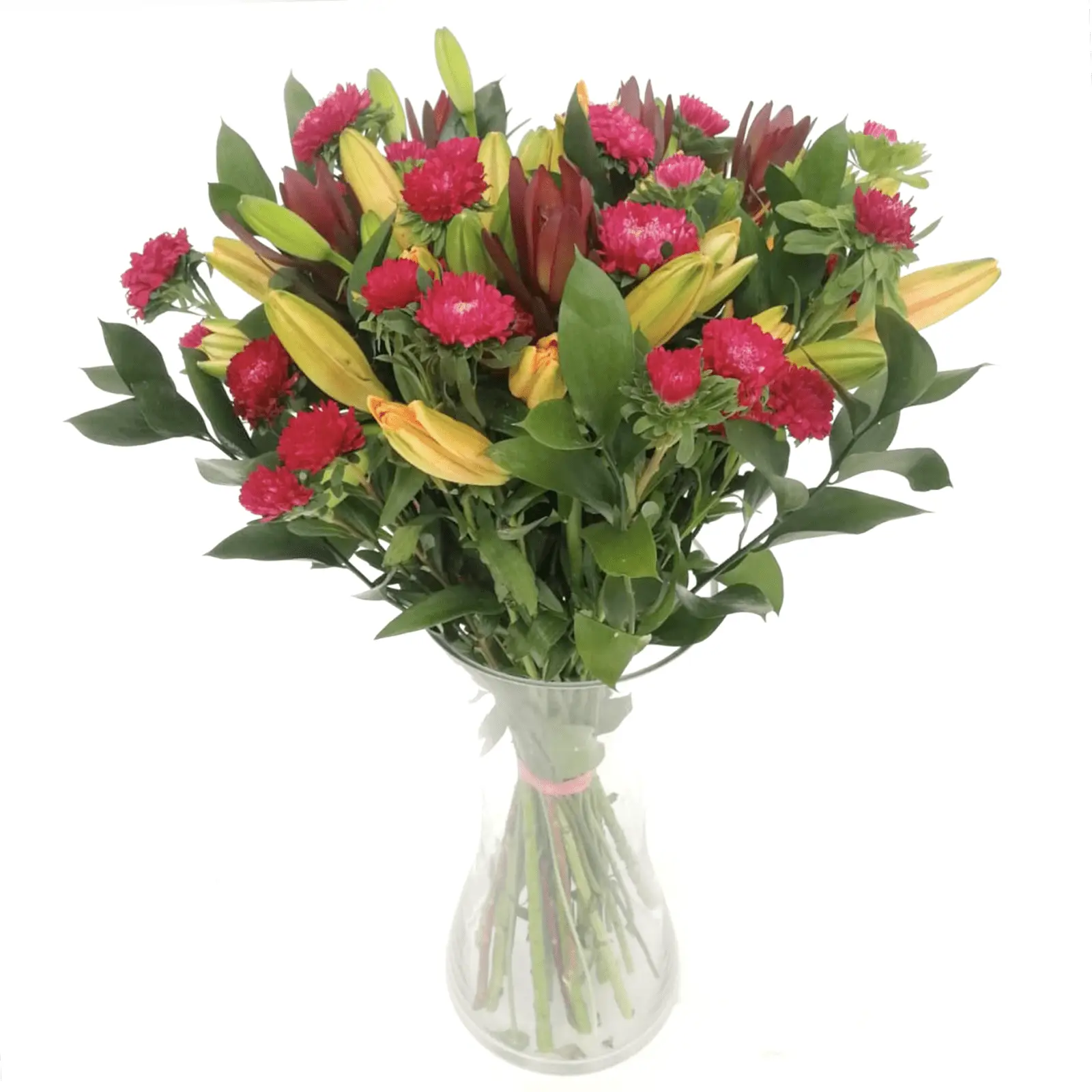 זר מיוחד בשילוב של הצבעים כתום וסגול-ורוד עמוק. מעוצב בפרחי ליליה כתומים ושורש אסטר סגול ורוד בשילוב ענפי ירק