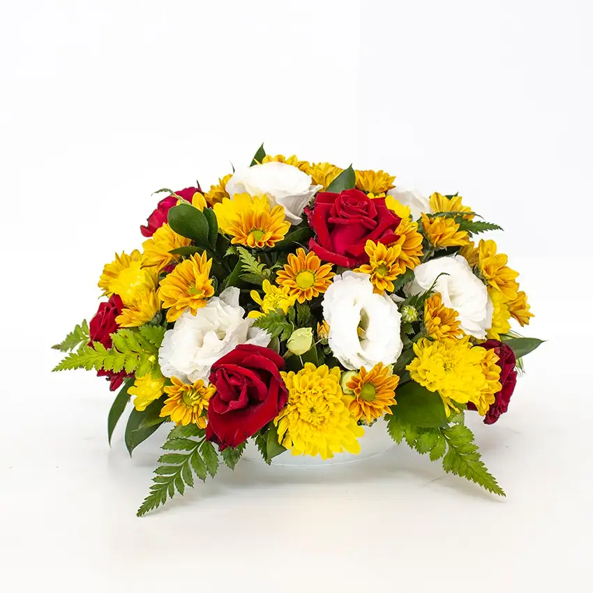 סידור עגול, מעוצב בורדים אדומים, חרצית צהובה, חרצית כתומה-חומה, ליזיאנטוס לבן וירק